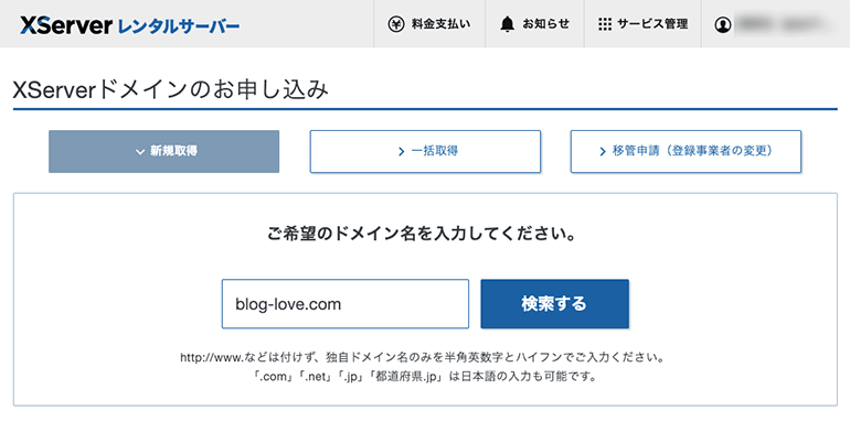 XServerドメインのトップページから取得希望のドメインを検索できます。